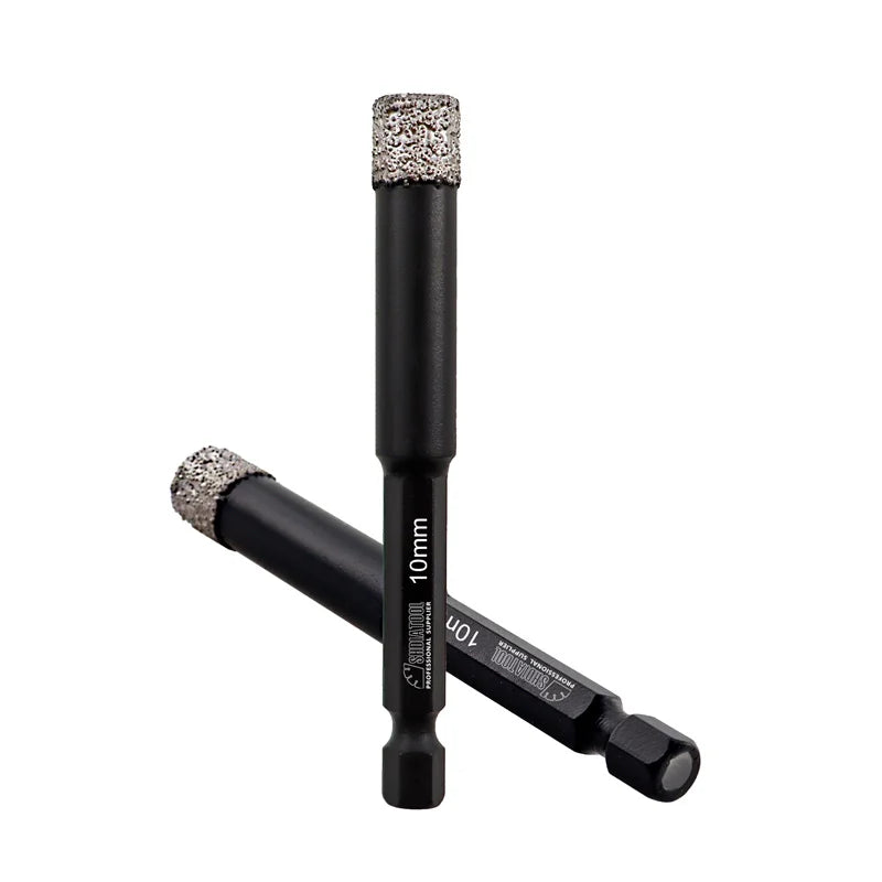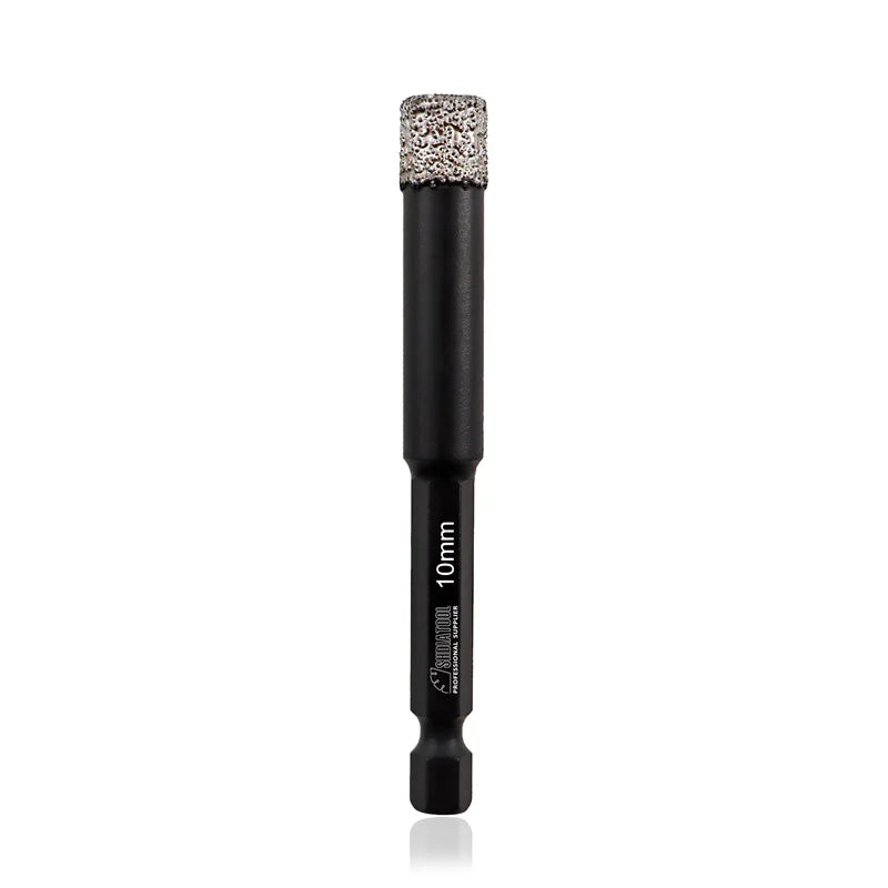 Dijamantska kruna Ø10 mm sa heksagon (HEX) prihvatom (šifra A8561010) namenjena je brzom i preciznom suvom bušenju tvrdih materijala, uključujući porcelanske i keramičke pločice, granit, mermer, blok i opeku, veštački i prirodni kamen. Zahvaljujući ugrađenom vosku za hlađenje, kruna efikasno disipira toplotu i omogućava rad bez dodatne vode, što je idealno na terenima gde voda nije dostupna ili bi mogla da smeta pri radu.