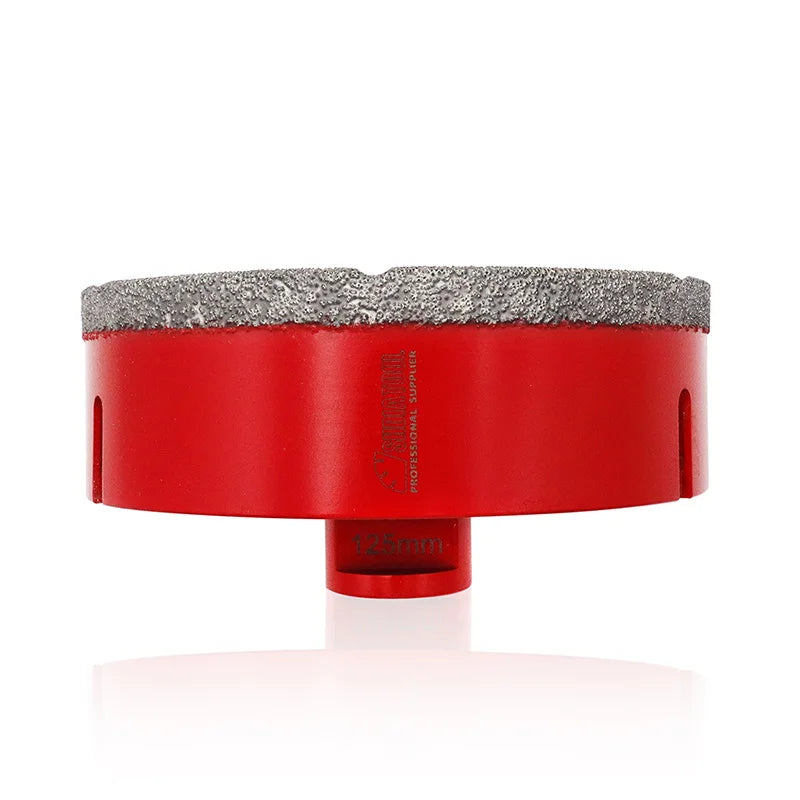 Dijamantska kruna Ø125 mm sa M14 navojem (A85312510) namenjena je pravljenju velikih otvora u tvrdim materijalima kao što su porcelanske i keramičke pločice, granit, mermer, cigla, kamen i beton, poseduje vakum lemljenu dijamantsku oblogu dužine 10 mm za brzo i glatko bušenje uz minimalno pucanje ivica, podržava suvo i mokro bušenje radi manjeg pregrevanja i dužeg veka trajanja, montira se direktno na ugaonu brusilicu M14 ili na bušilicu/aku odvrtač preko adaptera, što je čini idealnim izborom za profesionalne instalacije (vodovod, elektro, ventilacija) i zahtevne „uradi sam“ projekte gde je važan čist, estetski otvor velikog prečnika.