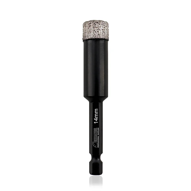 Dijamantska kruna Ø14 mm HEX (A8561410) namenjena je suvom bušenju bez vode zahvaljujući ugrađenom vosku za hlađenje, koristi vakuum lemljenu dijamantsku oblogu dužine 10 mm za brzo i precizno bušenje porcelanskih i keramičkih pločica, granita, mermera, bloka, opeke i prirodnog/veštačkog kamena, montira se na standardne bušilice i akumulatorske šrafilice preko 1/4" HEX prihvata, radi isključivo u rotacionom modu (bez udarnog bušenja) i idealna je za otvore za kupatilske, kuhinjske i dekorativne elemente uz minimalan rizik od pucanja pločica i oštećenja ivica.