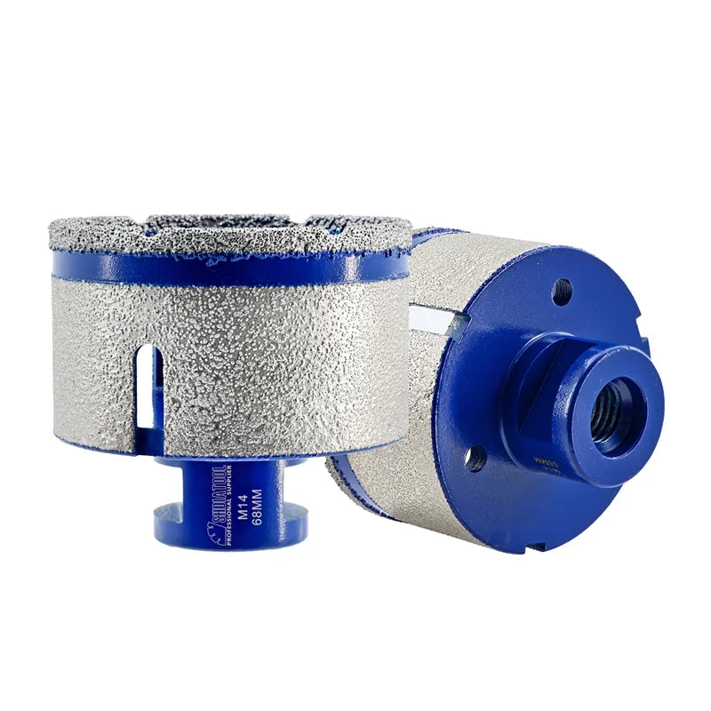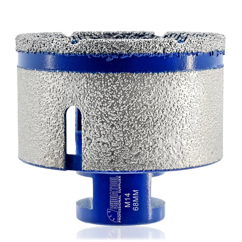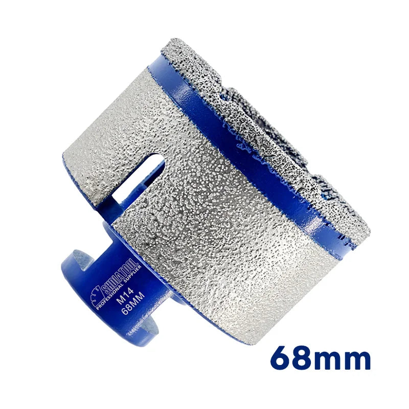 2-u-1 dijamantska kruna Ø68 mm (A865068M14) za bušenje + finiš obradu ivica (segment 5 mm + 30 mm) na porcelanu/keramici, mermeru, granitu i kamenu — idealno za veće otvore (sifoni, tuš kanali, rozete). Vakum-lemljeni dijamanti = brz prodor i čiste ivice; M14 navoj za ugaonu brusilicu; rad suvo/mokro (opt. ~6000 o/min, max 11000 o/min, bez udarnog režima).