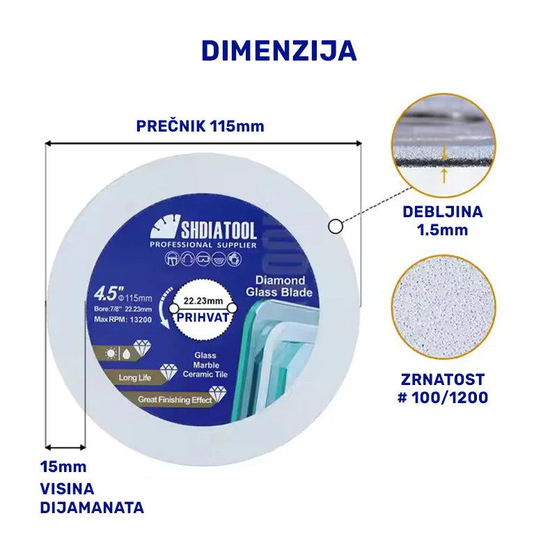 Dijamantska rezna ploča 115mm za staklo, keramiku, mermer, granit i porcelan – A8161451522
