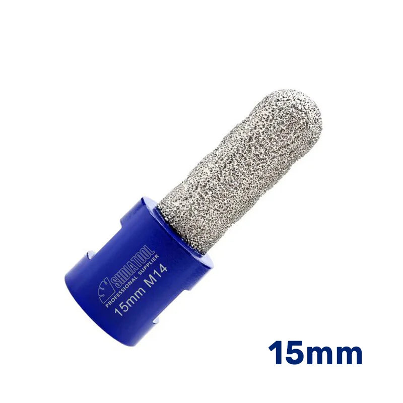 Dijamantska valjkasta kruna prečnika 15mm sa M14 navojem (šifra A867715M14) je specijalizovan alat za graviranje, precizno brušenje i proširivanje postojećih otvora u kamenu, mermeru, granitu, keramici, porcelanu i drugim tvrdim materijalima. Zahvaljujući vakuum lemljenju i dijamantskim zrnima granulacije #45/50, valjkasta kruna obezbeđuje brzo uklanjanje materijala i glatku završnu obradu bez pucanja ivica.