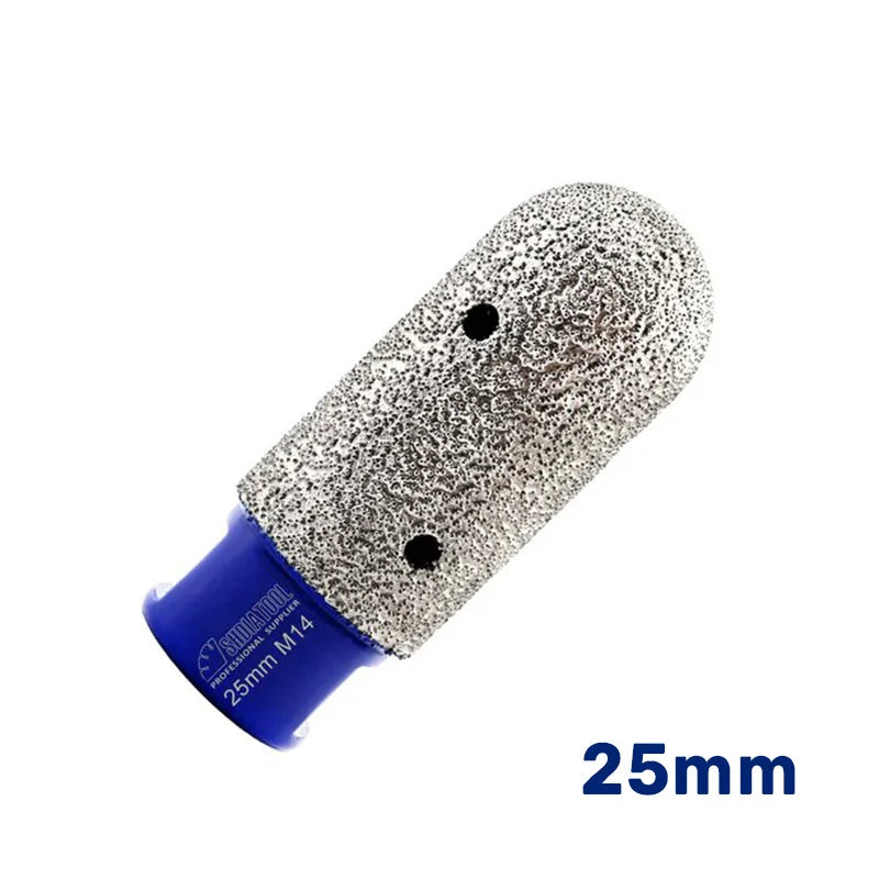 Dijamantska valjkasta kruna prečnika 25mm sa M14 navojem (šifra A867725M14) namenjena je za graviranje, precizno brušenje i proširivanje postojećih otvora u porcelanu, tvrdoj keramici, mermeru, granitu i prirodnom ili veštačkom kamenu. Zahvaljujući vakuum lemljenju i dijamantskim zrnima granulacije #45/50, valjkasta kruna obezbeđuje brzo, kontrolisano skidanje materijala i glatku završnu obradu bez pucanja ivica.