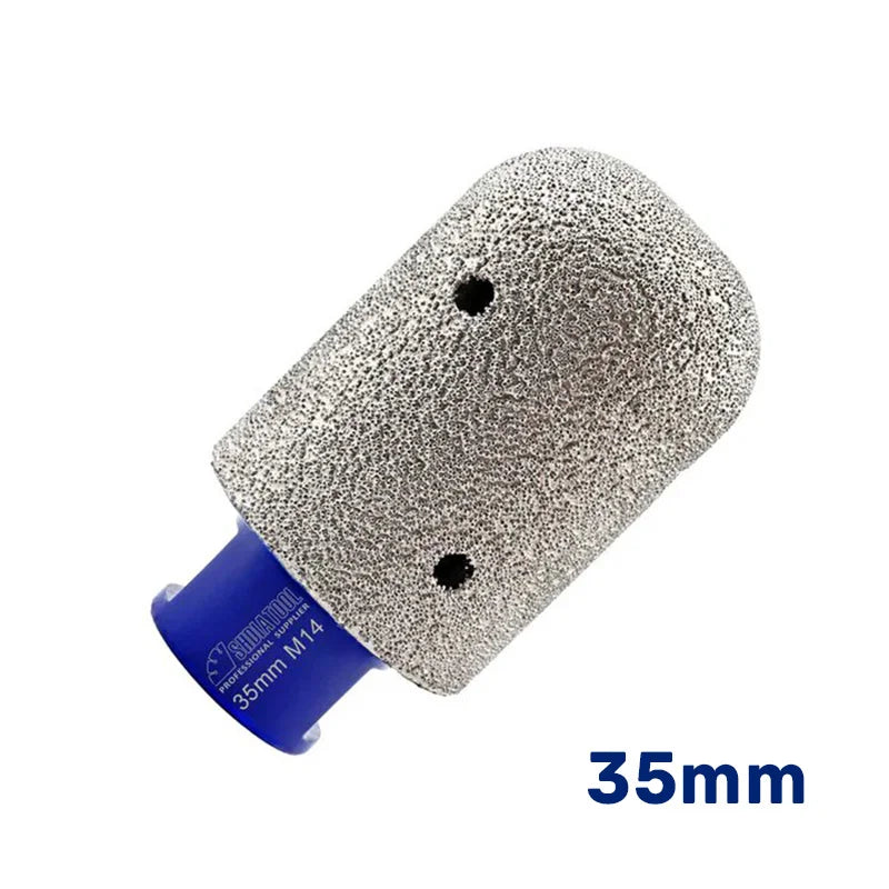 Dijamantska valjkasta kruna prečnika 35mm sa M14 navojem (šifra A867735M14) predstavlja pouzdan i efikasan alat za precizno proširivanje, oblikovanje i doradu otvora u porcelanu, tvrdoj keramici, mermeru, granitu i kamenu. Zahvaljujući vakuum lemljenju i dijamantskim zrnima granulacije #45/50, valjkasta kruna obezbeđuje brzo i kontrolisano uklanjanje materijala, uz minimalan rizik od pucanja ivica i lomljenja površine.