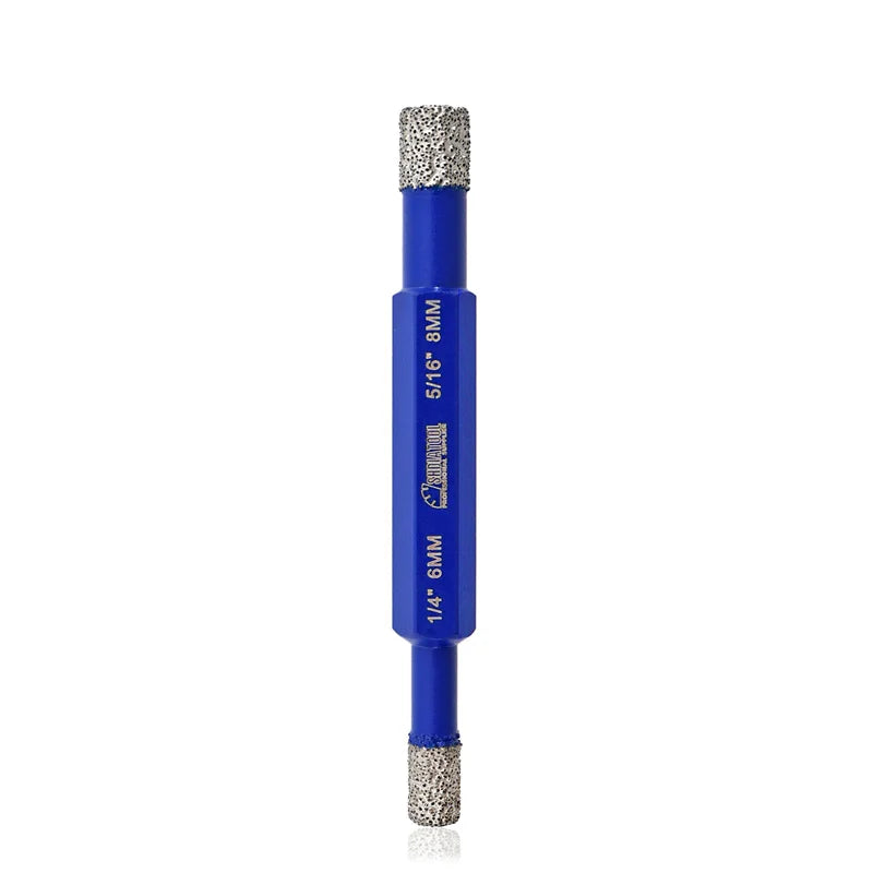 Dvostrana dijamantska kruna Ø6–8 mm HEX (A8646810)2 u 1 (Ø6 mm + Ø8 mm) za brzu promenu prečnika bez menjanja alata; ugrađen vosak za hlađenje za suvo bušenje bez vode; vakuum lemljena dijamantska zrna #45/50 i dijamantska obloga 10 mm po strani za čist, precizan rez; 1/4" HEX prihvat (bušilice/šrafilice), rad isključivo rotaciono (bez udarnog); idealna za porcelan/keramiku, granit, mermer, blok/opeku, prirodni i veštački kamen — uz savet: start pod ~45° na glatkim pločicama, potom ispravi na 90°.