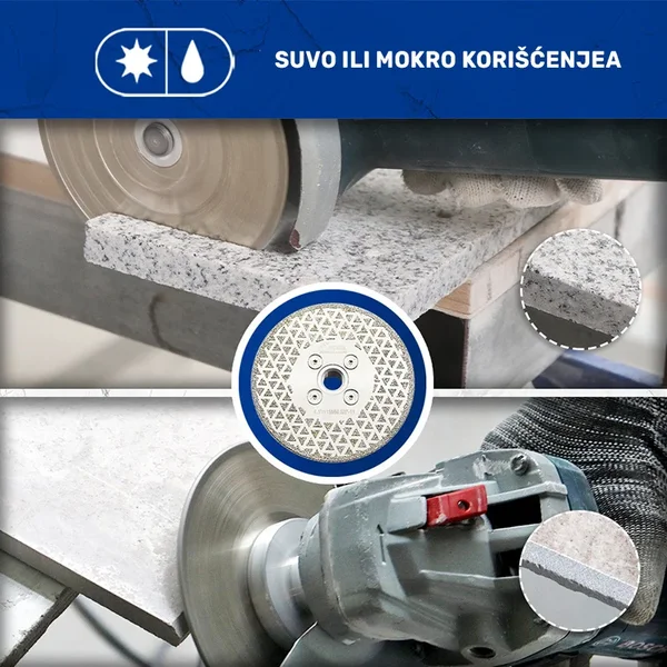 Dijamantska ploča Ø115 mm elektroplatirana i dvostrano obložena omogućava brzo sečenje i efikasno brušenje ivica bez potrebe za promenom diska. Idealan izbor za rad sa pločicama, mermerom i kamenom.