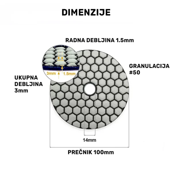 Dijamantski suvi polirni pad 100 mm #50 namenjen je za grubu obradu granita i mermera. Idealan je za uklanjanje neravnina i pripremu površine za finije poliranje.