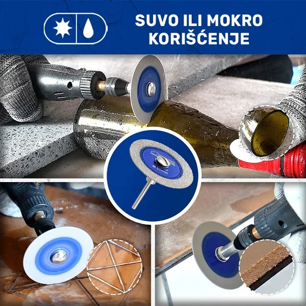 Mini dijamantska ploča Ø40 mm x 1 mm omogućava precizno sečenje, graviranje i izradu kanala na staklu, keramici i kamenu. Idealna je za detaljne radove gde je potrebna kontrola i čista ivica bez pucanja.