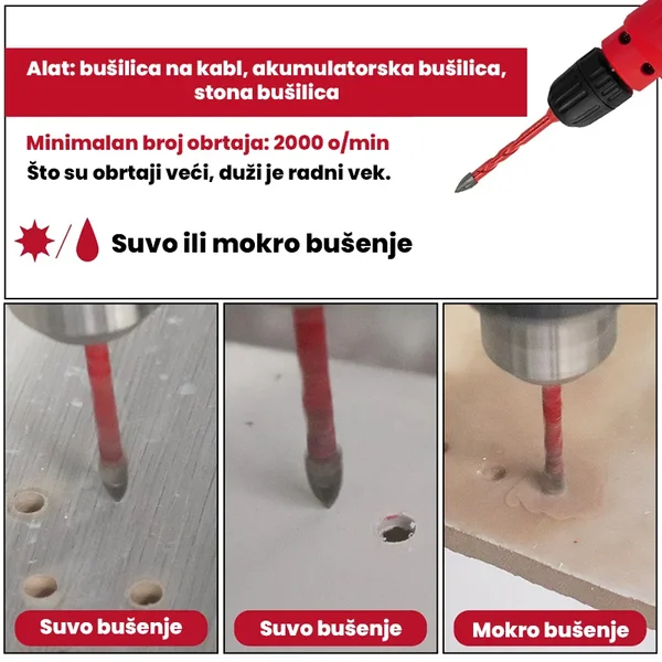 - Krstasti vrh: Precizno bušenje bez klizanja i pucanja pločica