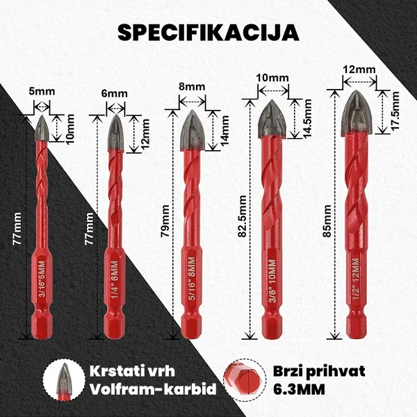 Set burgija za pločice 5–12 mm sa volfram-karbidnim vrhom namenjen je preciznom bušenju keramike, porcelana, mermera, granita i drugih tvrdih materijala. Krstasto brušen vrh omogućava tačan početak bušenja bez klizanja po glazuri i bez oštećenja površine.